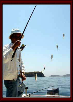 11:30前に出航、犬島南を通り、ママカリポイントに向かう、波もほとんどなく、気持いい、今まで、試乗以外に他の船に乗ることがほとんど無かったので、ほんとうれしくなる、景色などがのんびり楽しみながら、ポイント到着、数艇ママカリを釣っている、一番南側にポイントを決めて投錨、早速釣りにかかる。