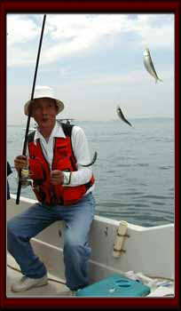 魚探を見るが大きな魚群はいない、小さなのがちらほら、退屈しない程度に釣れる。しばらく釣っていると流れが緩くなってきたので、ママカリが付いている仕掛けをそのまま底に泳がせていたらセイゴが食い付き、大事に取り込みました、船長○憲さんありがとう。その後takkieさんの泳がせ釣りにコウイカが・・・、そこまで寄せていたのですが、さようならと言ったかどうかわかりませんが帰っていきました、残念(^_^;)、流れの向きが変わりポイントを移動、潮目と言うか沸き上がっている様な所で続けて釣り、時間も来たので17:00本日終了としました。