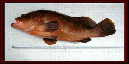 3mのメバル竿が水面に突き刺さる、ラインはPEラインで大丈夫、ハリスが2.5号どれだけ持つか?、何度も引き込みがあり、どうにか水面に姿を現したのは高級魚のアコウ(キジハタ)、ここで息子すかさずネットでキャッチ、船に取り込みハリスを引っ張ったところ、ハリス切れ寸前だったのかぷつりと切れました、針は何度も使って錆びて返しが無くなっていました。良く上がってきたなと言う感じでした。