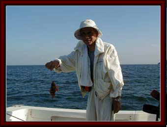 新艇になって、やっとご一緒出来ました、takkieさん登場です。数日前より予定していましたが、当日は南西の風が強く波1mの予報が出ていましたが、西からの風は今日の目的地は影響が少ないので決行しました。15:00に出航し追い波の中サーフィンしながら金ヶ崎へ、まずはアジの反応を見るが反応は少ない、夕方までの時間つぶしに、投錨し私はサビキでアジ・アコウ狙い、takkieさんは虫餌でペラ・キス・カサゴ狙いで釣り始める。