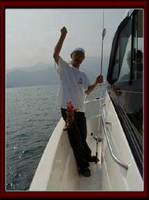 早速投錨し、サビキの準備、魚探の反応はまずまず、みんな釣り始めると豆アジが上がる、後はちっちゃなタイゴ・スズメダイ(^_^;)、そしてしばらくすると、左舷側で釣っている海賊が竿を満月に曲げている、しばらくやり取りしていたが、ハリス切れでアウト(^_^;)、ツバスかアコウのようでしたが残念、ちょっとして、またまた海賊にアタリ、今度は先ほどより小さそう、慎重に上げ姿を見せたのは、30p位のアコウ(^_^)/、これで一気にみんなの目が血走る(^_^;)。