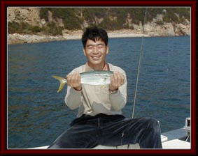 ぼつぼつ私もと、みんなの釣った豆アジを餌にアコウ狙い、ピンポンー、ヒットー(^_^)/、良い引きをする、ドラグを調整しているので大丈夫そう、やり取りしながら上がってきたのは41pのツバスでした(^_^)/。2匹目を狙おうとハリスをチェックし結び直して再投入、ちょっとしてまたアタリがありグイグイ引く、先ほどのより良い型のよう、少しずつしか巻けない、後10mというところでふっと軽くなりばらし、上げてみるとハリスの真ん中あたりがささくれてブツリ、魚が向こうを向いているとき擦れて切れたようでした(^_^;)。