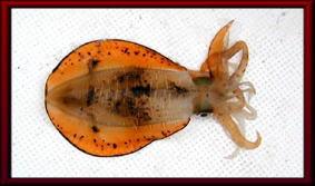 次のアジが釣れない、魚礁で2匹釣れ、またいつものポイントまで戻り沈める、今度はゴミでも掛かったのかなと思う様な感じで上がってきたのは、アオリイカ(多分そうだと思うのですが、初めてなので自信がない)サビキの針がうまく掛かってラッキーでした。