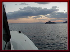 16:30頃、仕舞って帰ろうか、夜釣りに行こうか迷いましたが、今帰っても波があるし通勤ラッシュにかかるし釣果もないしで、夜釣り決行、夜になれば風も落ち楽に帰ることが出来る予定(^_^)V、小豆島東側は波高20センチくらいで穏やか、明るいうちに大角鼻到着、満ち潮なので西側に行きたかったのですが、西の風で波があり東側の少し入った風の当たらない所に二本錨で掛けました。