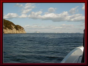 帰りの海ですが、東側は来るときと同じで穏やか、金ヶ崎をまわって北側に出たところで、なんじゃこりゃ、予想に反して、来るときと同じ位の波で、当然の向かい波、またまた、操船したなと実感出来るほど集中して帰りました(^_^;)。