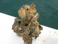 小豆島側に到着してママカリポイントを見ても、ウネリがあるし反応もなし、もっと西の風裏に移動すると、波を避けた船が結構居ます。出来そうなところをぐるっとパトロールして、虫えさ天秤仕掛けで釣りを始めます。ここではこんな釣りしたことがなかったのですが、魚礁か岩なのかそんなところで良型のカサゴが釣れます。たまにキスも釣れました。友香丸はお姫様を二桁釣りこれは新記録です(^_^;)。途中本日の大物賞、フジツボ・ミニヒトデ・訳のわからない生物の付いた石を釣り、水槽に入れて飼ったら、などと言っていましたが丁重にドボンとリリースしました(^_^;)。