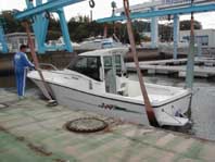 右が水漏れがあった物入れ、少し溜まってます。 ここに、魚探の発信器を取り付けています。 もう少し角に付けて欲しかったよ〜。 物入れが狭くなってしまいました。 進水の反対で、陸揚げです。 |